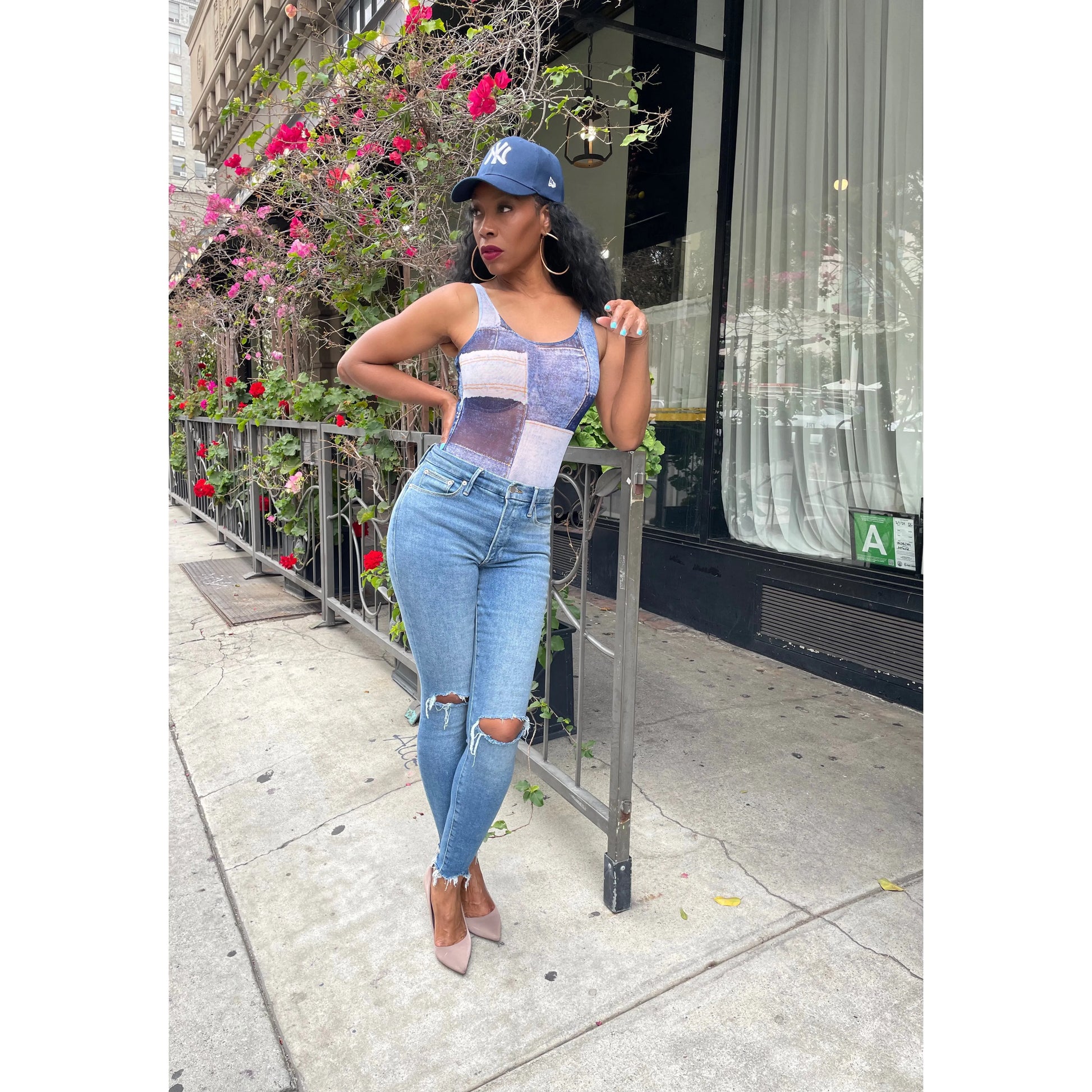 Denim blue- * soft mesh sheer fabric* Bold patchwork printed denim inspired mesh bodysuit pairs perfectly with any shade of denim, making it a versatile addition to your wardrobe.