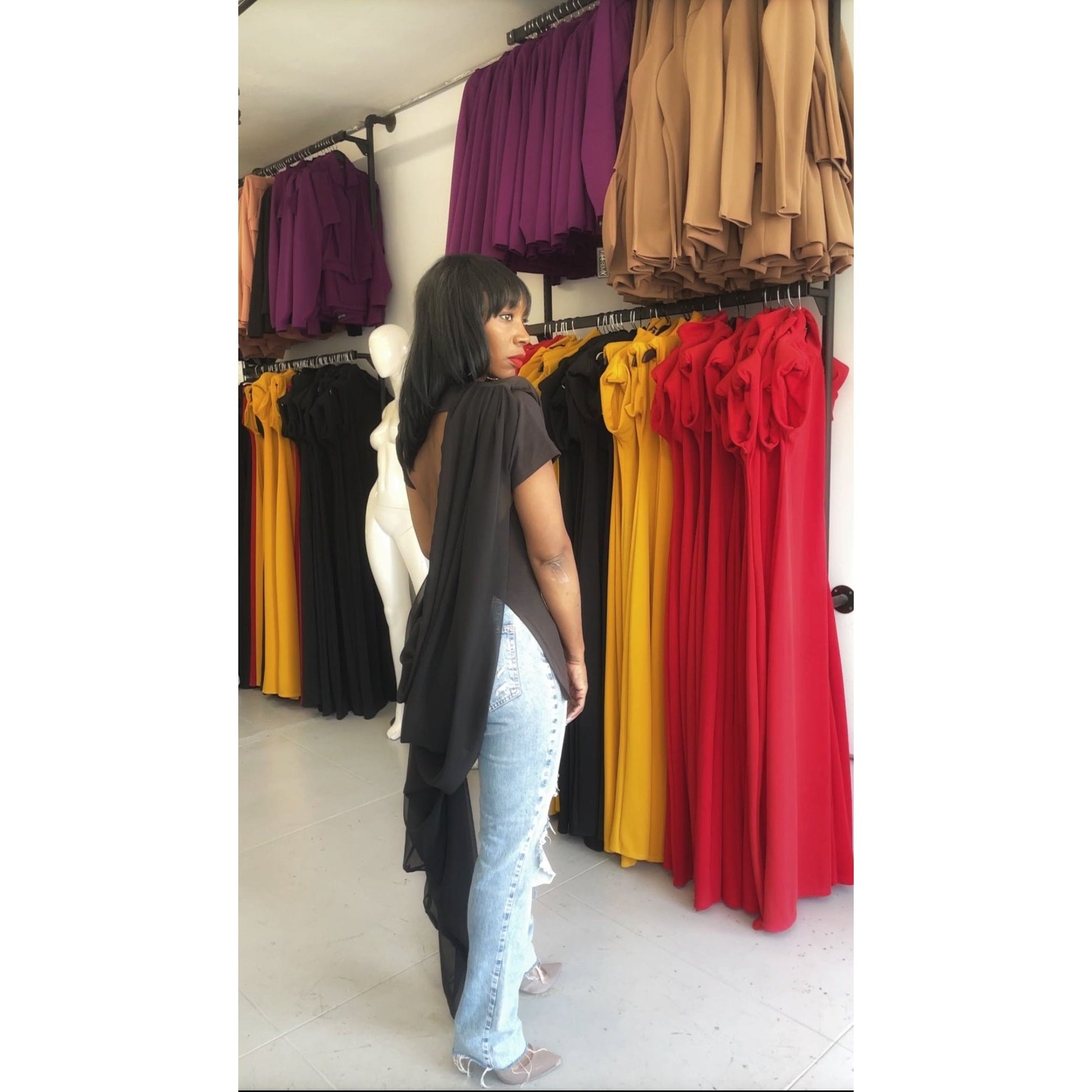 Elevate your style with this flowy, custom design that's anything but ordinary. With a stunning open back detail, you'll turn heads from every angle! Are you ready to stand out?